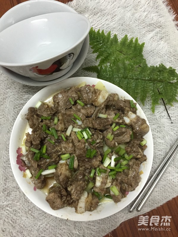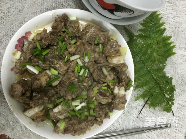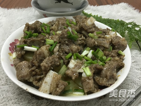 7.把马铃薯放入碟子的底部,排骨均匀的铺在上面