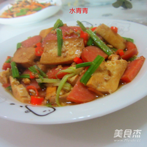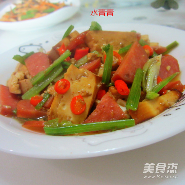 香干芹菜烧烤肠,家常混搭菜。用自已平常喜欢吃的食材配搭在一起,相互融合各自鲜美的味道,即家常又营养。经济又实惠,好吃又美味。 主料 香干250克 芹菜50克 烤肠200克 小米椒5个 辅料 盐2克 生抽5克 植物油15克 鸡精2克 香干芹菜烧烤肠的做法 1.备香肠,烤肠 2.切片,切点芹菜,米椒 3.先炒香干 4.放盐 5.炒入味 6.淋上生抽或酱油上色 7.放进米椒提辣 8.放进烤肠 9.放进芹菜提香 10.炒匀 11.撒上鸡精 12.可适放一点点清水,不放也行。 13.烧开装盘 烹饪技巧 先将香干炒香炒入味