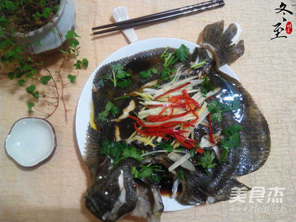 5.将蒸好的多宝鱼取出,扔去姜葱,倒掉蒸鱼时渗出的水,浇上蒸鱼豉油