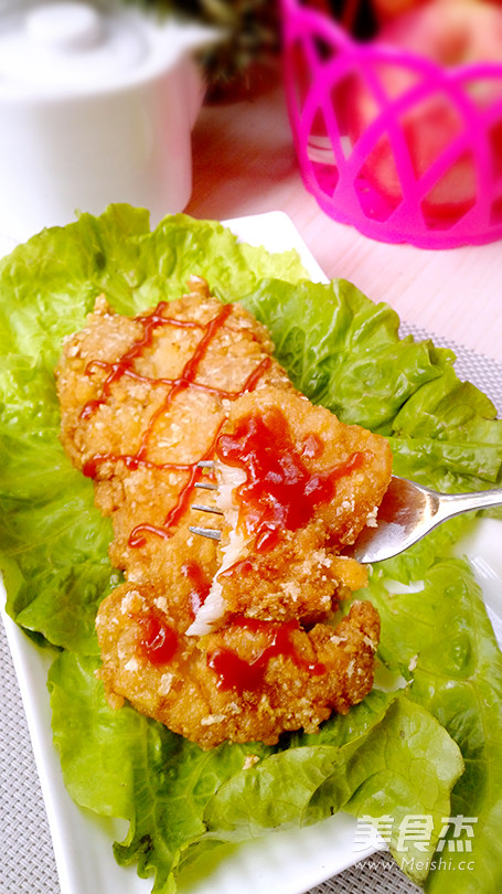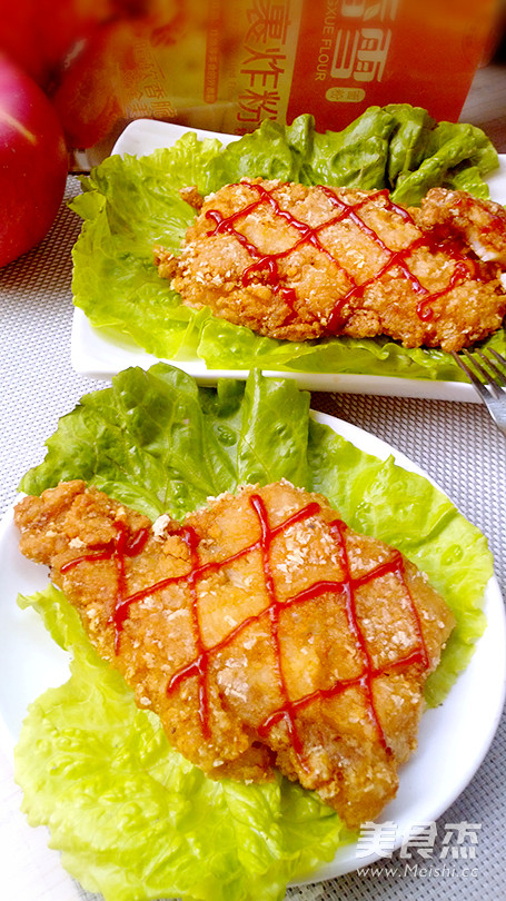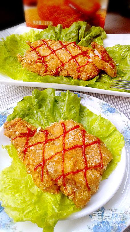 9.记得放在吸油纸上,吸掉过多的油脂,配上生菜,淋上番茄酱,趁热吃吧。