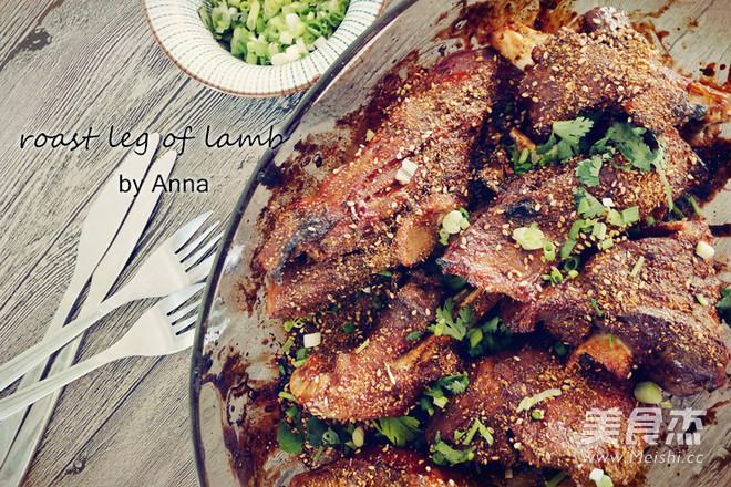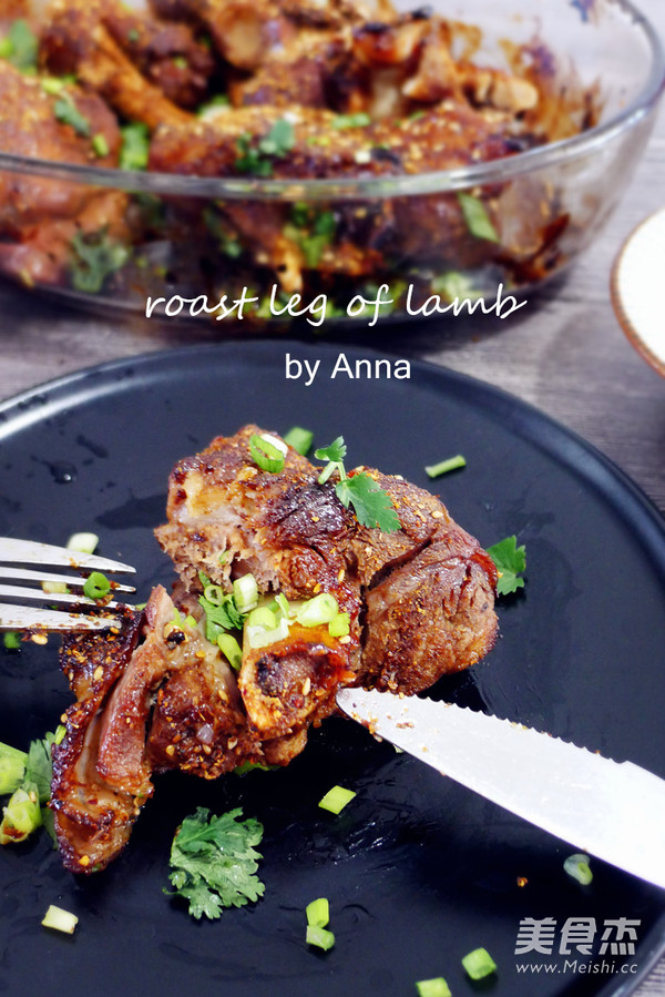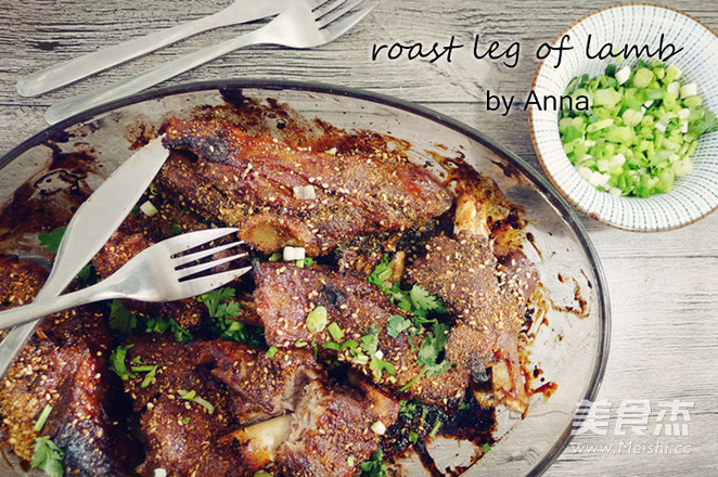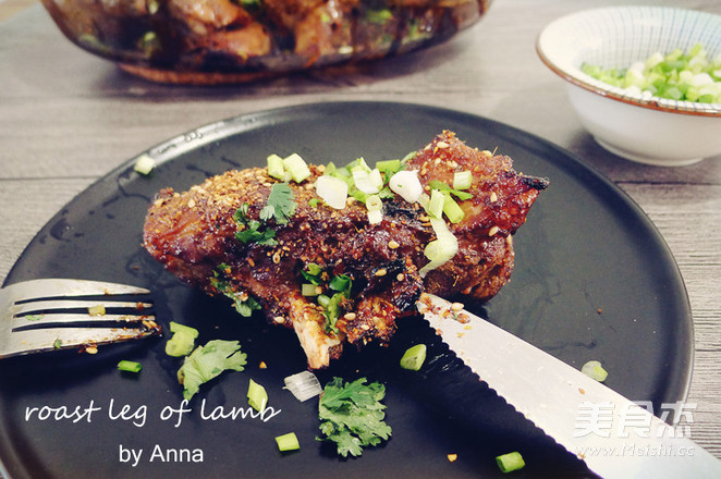 5.酱料刷在羊腿表面,放入烤箱烤制30分钟,十五分钟时取出再刷一遍酱料并且翻面,二十五分钟时撒上烧烤干料,烤制表皮香酥即可。