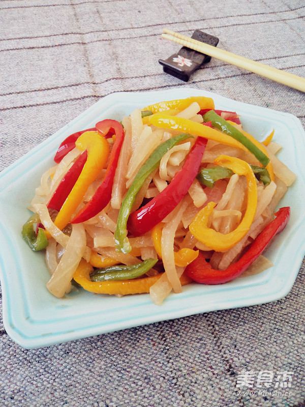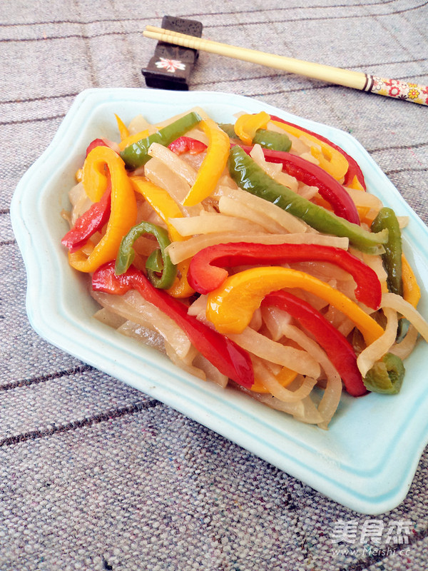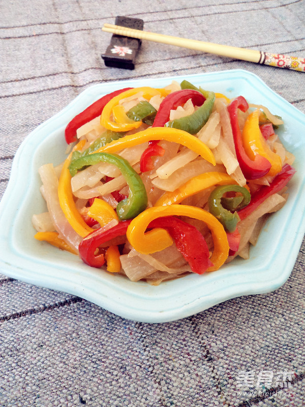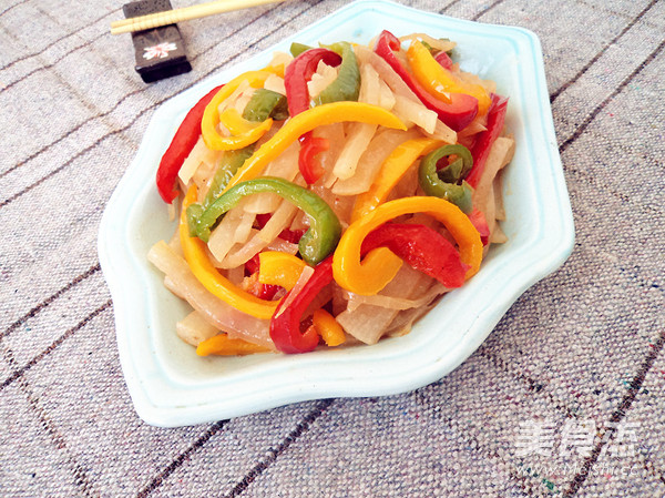 将冬吃萝卜这句话落实到了极致,进入冬季,各种萝卜没少吃。白萝卜与彩椒组合,很清爽的一道菜,好吃也好看,养生也保健。 主料 白萝卜300克 彩椒50克 辅料 油20毫升 盐2克 鸡精2克 葱姜5克 彩椒萝卜的做法 1.白萝卜、彩椒洗干净 2.白萝卜切成条 3.彩椒切成条 4.起油锅,彩椒入锅过油后盛出 5.再起油锅,葱姜入锅煸香后萝卜入锅炒 6.炒至萝卜塌,将彩椒入锅炒 7.加盐炒 8.加鸡精炒,炒均匀即可盛出享用 烹饪技巧 此菜清淡爽口,不宜添加色重味重的调味品。