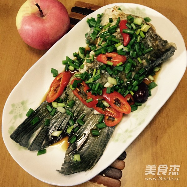 12.捞起鱼尾,撒上葱花,淋上蒸鱼豉油这个菜就OK了