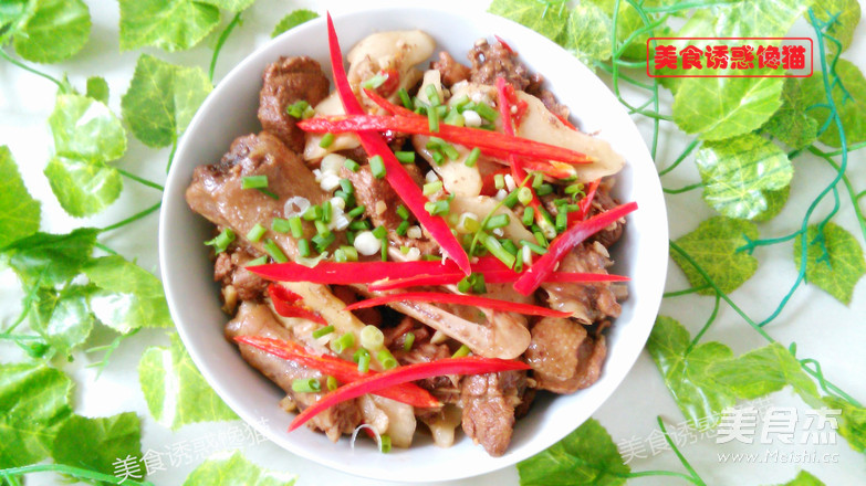8.煮至汁浓肉软时放适量鸡精炒匀,撒些葱花,起锅装盘,即可上桌