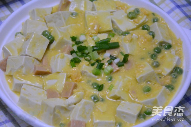 1.将豆腐用淡盐水侵泡10分钟后切成小块,豌豆洗净,咸鸭蛋煮好后只留蛋黄部分。