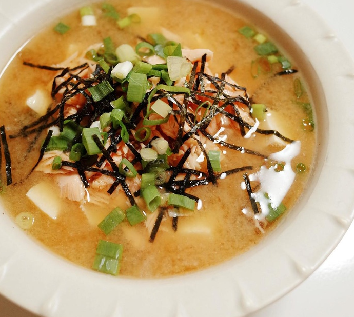 把烤过的三文鱼戳戳散,放到快煮好的味增豆腐汤里面,盛出来之后再撒上葱花和海苔丝,有荤有素,健康低卡。当然也可以像题图那样用整个三文鱼头来做味增汤咯,不过鱼头脂肪含量实在是高,我自己觉得吃得有点腻 ╮(╯_╰)╭