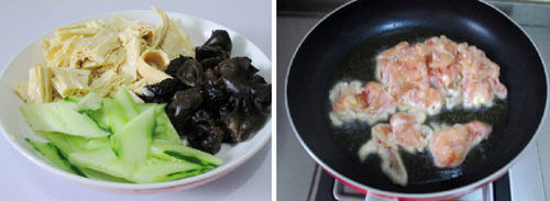 4、锅中注入油,烧热下入鸡肉片翻炒至变色。