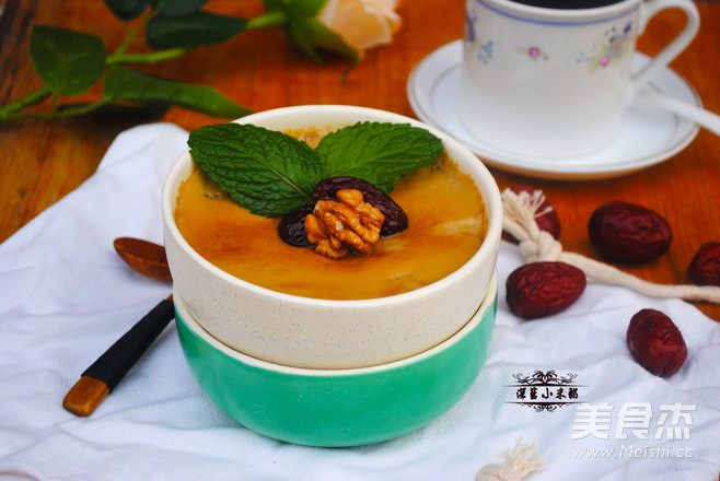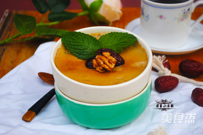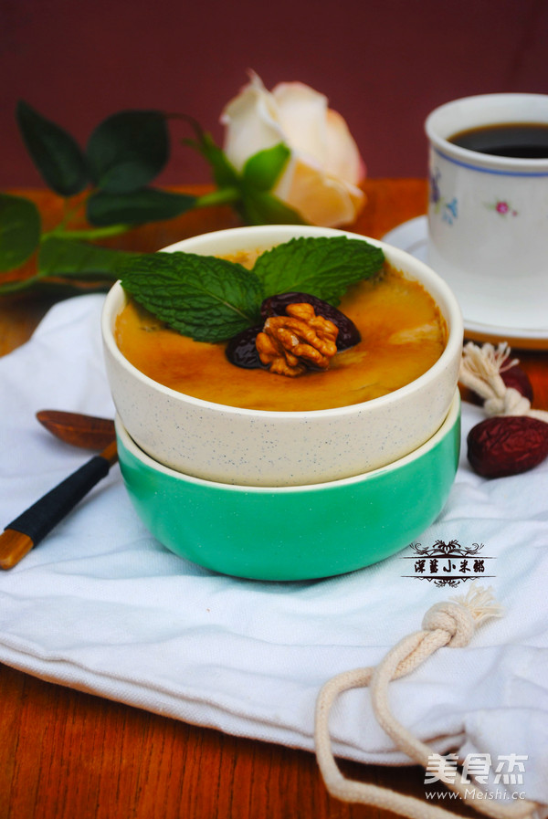 5.将熬好的红枣姜茶趁热倒入打散的鸡蛋中,搅拌均匀,再将核桃粉也倒入碗里搅拌均匀。