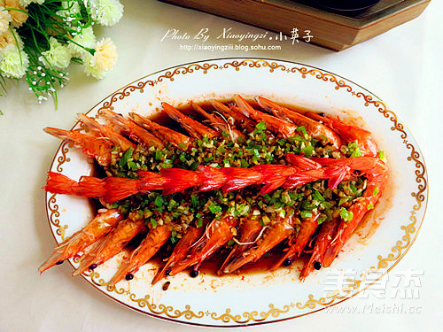 13.将蒸好的虾盘中的水倒掉,淋上适量的蒸鱼豆豉入味即可
