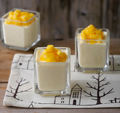 将作法2的材料倒入任一容器,放入冰箱冷冻3小时取出,放上芒果丁即可。