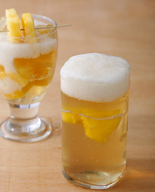 3、将作法2的果冻用果汁机打成啤酒泡泡液,倒入作法1冰好的啤酒果冻,摆上凤梨片作装饰即可。
