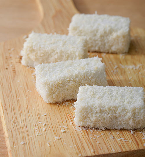 3、将作法2的椰糕,切成食用大小,沾满椰子粉即可。
