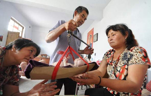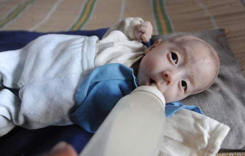 从外面回来的爷爷看到孩子哭闹,从桌子上浑浊不堪的塑料瓶里挖了两杯勺奶粉给孩子冲着喝,当“天使爱婴行动”志愿者问及为什么孩子的食量如此小时,憨厚的爷爷顿时两眼泪珠,他指着孩子隆起的肚子说:“孩子不能排便,大便小便都从小鸡鸡排出,吃的多了排不出他更难受。现在每天只给孩子吃两次奶,每次两杯勺,孩子因为饥饿一直啼哭,也不能让他多吃,活着我们全家就有希望。”听到这番话,现场所有人泣不成声。