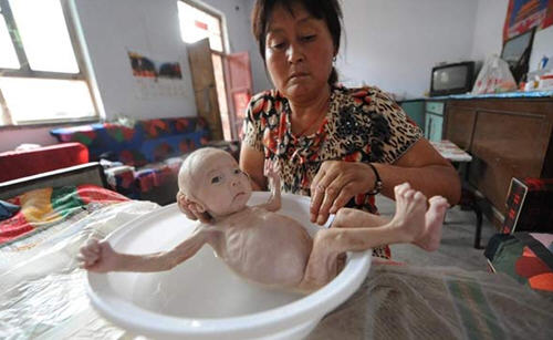 山西长治市壶关县桥上乡川底村,出生80天的郭恩泽先天无肛,四肢萎缩得只剩皮包骨头,排泄系统紊乱的他肚子微微隆起,身体到处是血青色,形状酷似“外星人”,体重从出生时的5斤变成了4斤8两,生命垂危急需手术。摄影/马俊明
