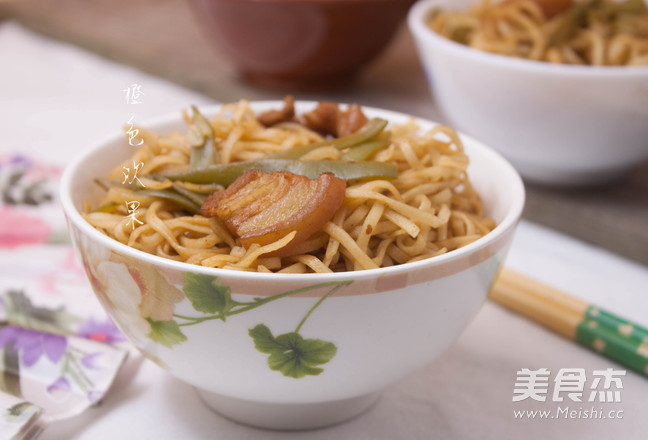 10.炒锅热油,下姜片葱段爆香,倒入五花肉片编炒出油,加入豆角翻炒,淋上生抽老抽。