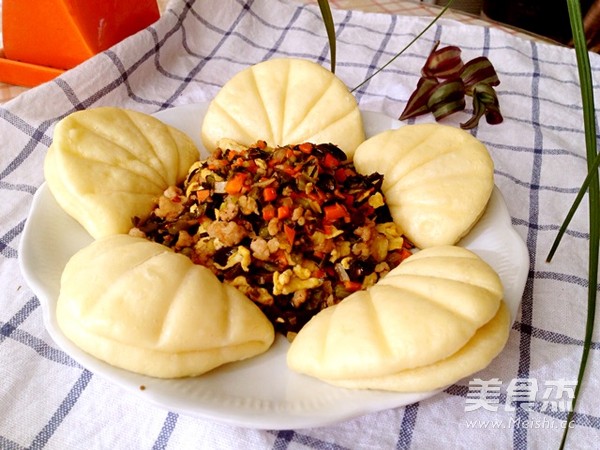 木耳 10克 雪里红100克 葱头30克 胡萝卜100克 鸡蛋1个 肉末100克 酵母3克 食用油适量