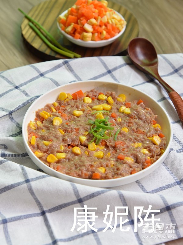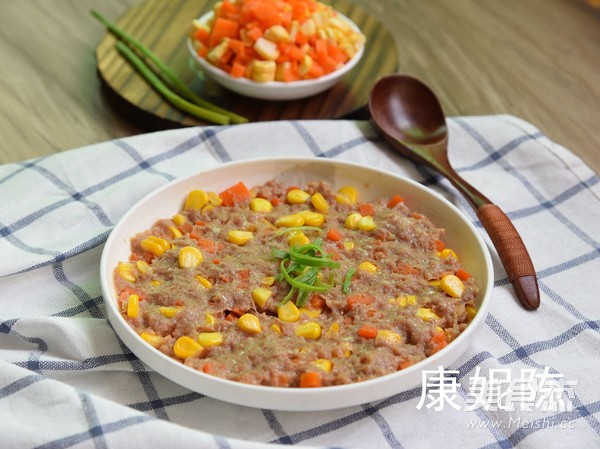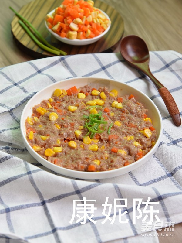我常常为家人做蒸肉饼,像梅菜蒸肉饼、冬菇蒸肉饼、咸蛋蒸肉饼。。。。。。蒸肉饼特别受家人欢迎,蒸肉饼营养健康。这次的【蒸玉米肉饼】香甜爽口,家常又美味。玉米含有碳水化合物、蛋白质、脂肪和胡萝卜素,玉米还含有核黄素、维生素等营养物质,玉米具有调和开胃,益肺宁心,清湿热,利肝胆,延缓衰老,特别有营养价值和保健作用。玉米蒸肉饼还放了一些胡萝卜,胡萝卜含有胡萝卜素,能治疗夜盲症,胡萝卜还含钙质、磷和铁等矿物质,胡萝卜还能保护呼吸道和提高免疫力的作用。