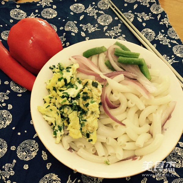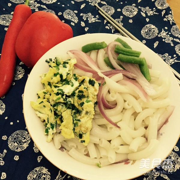 中午一个人吃~懒得做饭~~就吃通心粉吧 主料 通心粉100克 洋葱30克 豆角30克 韭菜20克 鸡蛋50克 辅料 油适量 盐适量 姜5克 营养通心粉的做法 1.准备好通心粉 2.准备好豆角、鸡蛋、洋葱、韭菜,姜 3.鸡蛋打散、洋葱切条、豆角切段、韭菜切小段,姜切片 4.先将通心粉焯熟透,捞起,用清水冲洗一下,沥干水分 5.电热锅放点油 6.加入韭菜段翻炒 7.加入鸡蛋 8.迅速翻炒,然后盛起 9.锅里加入水、姜片,把水烧开 10.加入通心粉 11.加入洋葱、豆角盖上盖,同煮3分钟 12.加入盐调味就好了 烹饪技巧 要煮熟透通心粉的时间比较长,可以预先用清水泡软再煮,这样可以缩短煮的时间。