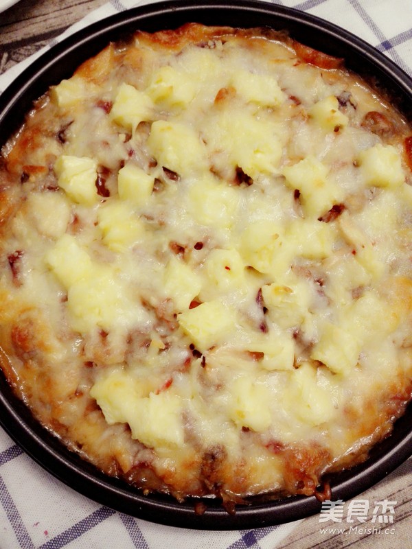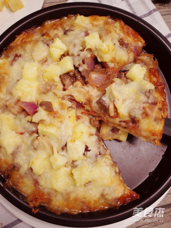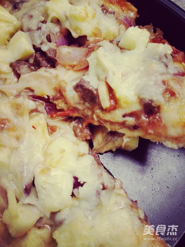 高筋面粉45克  橄榄油22毫升  芝士200克  番茄沙司15克  牛排50克  西红柿50克  洋葱50克  口蘑50克  菠萝50克