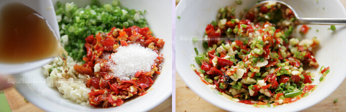 3、碗中放中剁椒、葱蒜粒、糖、盐、黄酒,将碗中调料轻拌匀。
