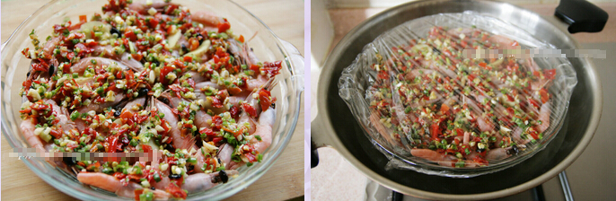 4、将调料撒在北极虾上,将盘子放入已上汽的锅中,大火蒸8分钟后即可。