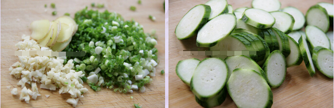 1、香葱、蒜切碎粒,姜切片,丝瓜刮去皮后,切成厚约1公分的片。