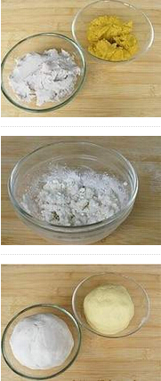 2.蒸熟的芋头、红薯用刀背按压成泥状备用,木薯粉慢慢调入开水,用筷子搅拌后加入芋泥或红薯泥揉匀,揉成软硬适中不粘手的粉团