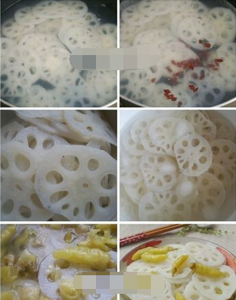 2.将片放入锅中开水氽烫,加入枸杞,氽烫熟的片捞出,放入中冰水中,凉透的片沥干水放进调配好的泡椒水中,盖上保鲜膜放中冰箱,一两个小时候后就可以取出食用了