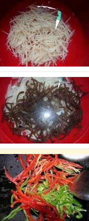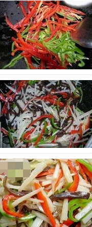 3.锅置火上,放油烧至五成热,倒入姜丝、青红辣椒炒出香味,倒入丝、木耳丝,加入盐、味精、白糖、白、花椒油拦匀装盘上桌 美食网